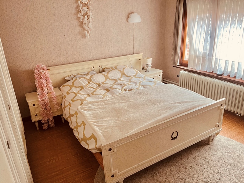 The available room has heating and a large window. The space can be arranged as desired. The bed and bedside tables can be removed, as can the wallpaper and flooring, if you prefer a more modern look.