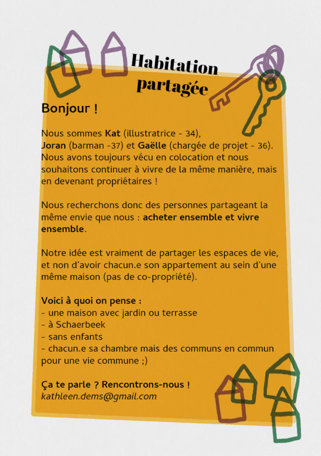 Nous serions ravi.es de faire connaissance avec toutes personnes intéressé.es à acheter une maison à Schaerbeek pour créer une colocation dans laquelle nous serions toustes propriétaires.