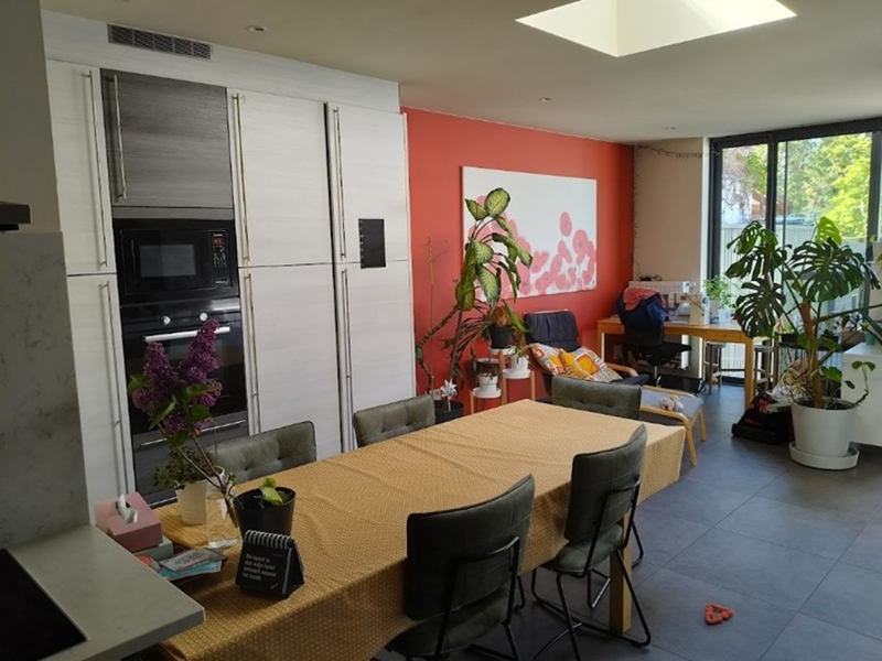 Attention: ceci est une simple colocation à 2 personnes (Ine, 52 ans, et Mirko, 19 ans), pas un habitat groupé. Tu partagerais une cuisine, un jardin et des espaces communs, mais sans communauté mature ni projets structurés comme le potager collectif que tu cherches. À proximité de Gand (20 min à vélo), proche des transports, jardin avec BBQ et possibilité de cultiver - mais l'ambiance reste informelle et en construction.