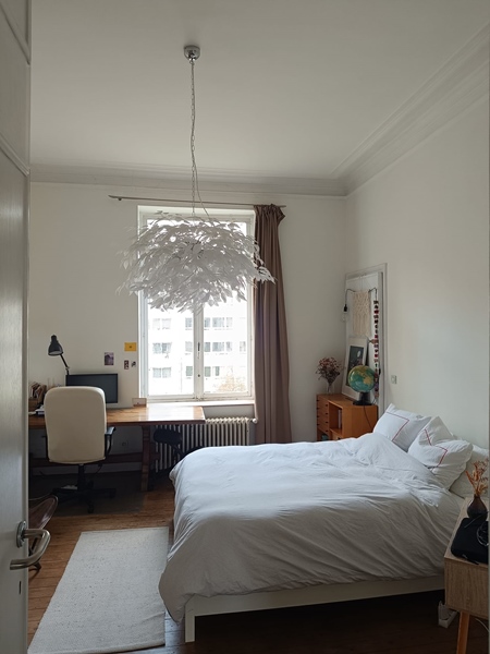 The owner lives on the ground floor and this is 1 of 3 apartments full of classic urban charm, but with modern interior. The apartment consists of 2 rooms: 1 small and 1 large. In the small room lives Clarisse, a very sweet, pleasant French student. You share the kitchen/living room and bathroom with her. Although not large in surface area, the high ceilings and the window with a view of the gardens create a spacious feeling in the apartment. In the hallway there are several cupboards that provide plenty of storage space. In the living room there is a Kallax cupboard with 4x4 compartments for extra storage space. In the corner next to the window there is a smaller built-in cupboard where we made the tea/coffee corner. In the kitchen there is a fridge, oven and (fast) heating plate included.