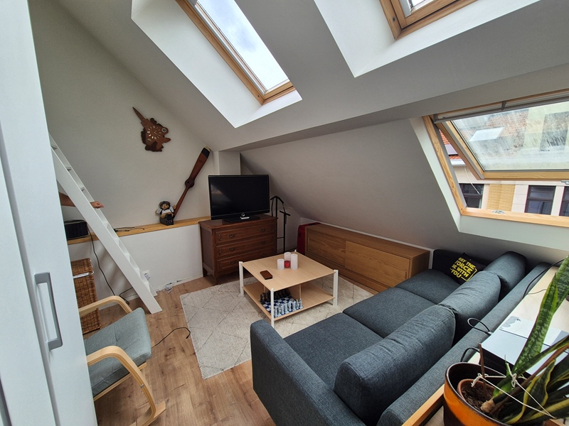 The room is located on the street side of the house and has several Velux windows, providing plenty of natural light. It is furnished with a wardrobe, a table with seating for six, a three-seater sofa, and a double bed (160x200). This bed is located in a separate sleeping area. The room has a private bathroom with a walk-in shower, sink, and toilet. This room was completely renovated in 2022.